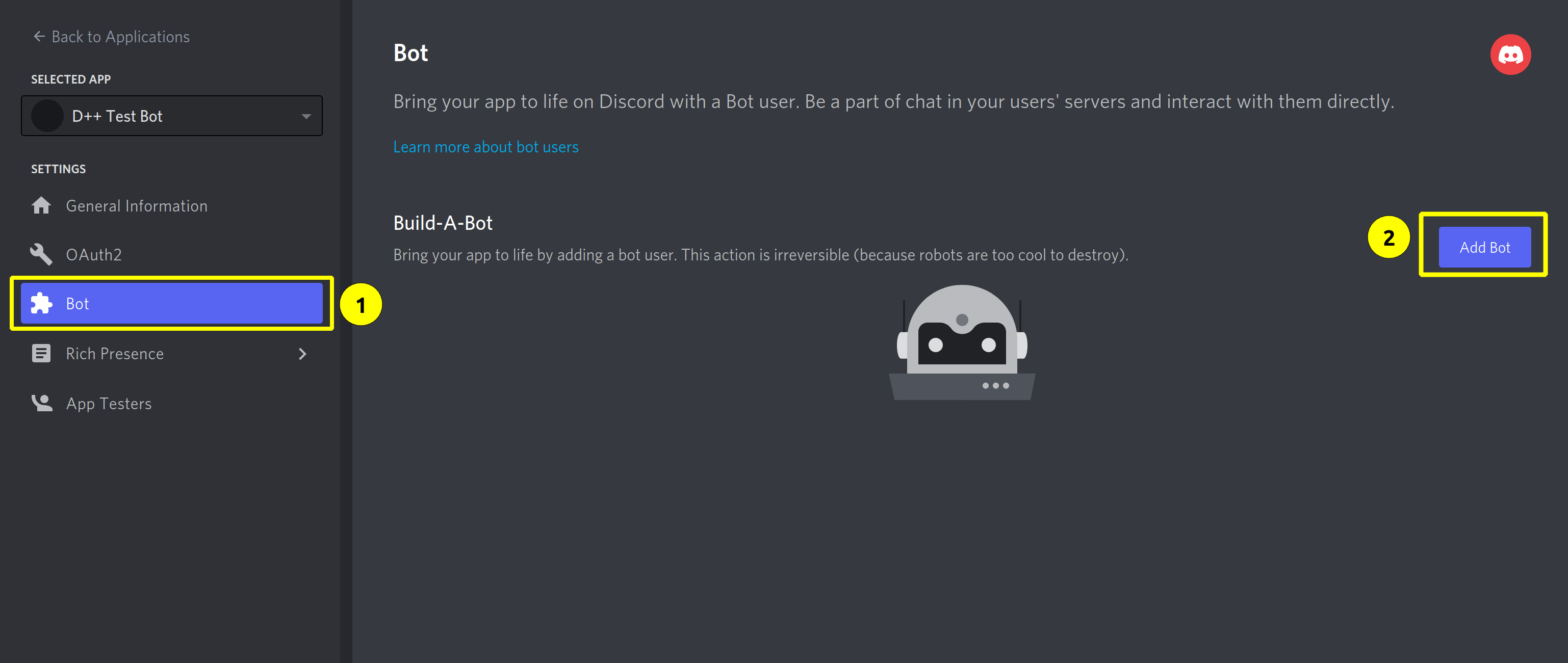 - Move on by click the "Bot" tab in the left-hand side of the screen. Now click the "Add Bot" button on the right and confirm that you want to add the bot to your application.