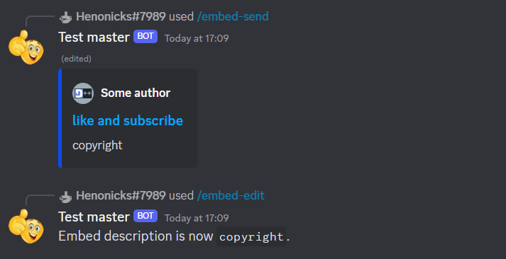 Now let's send an embed and edit it. If a message has one content field, it can have a few embed fields, up to 10 to be precise. So we first get the embed we want and edit and change its description.